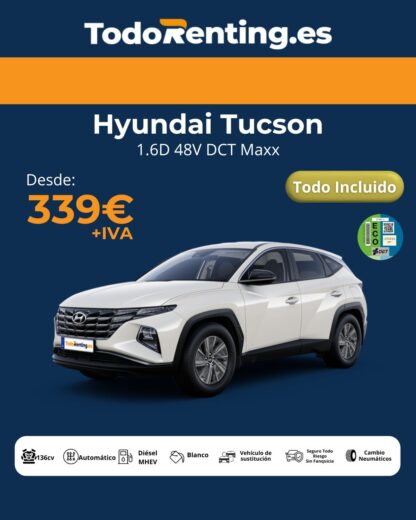 Con TodoRenting, puedes disfrutar del Hyundai Tucson desde 339 €/mes + IVA, sin entrada y con todos los gastos incluidos.