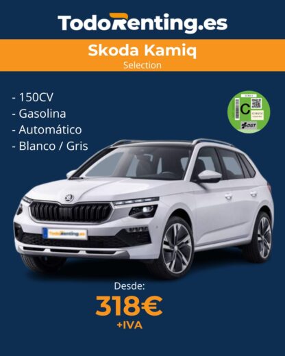 El Škoda Kamiq Selection se ha convertido en uno de los SUV más equilibrados de su segmento. Compacto, práctico y con un diseño moderno, ofrece una experiencia de conducción ideal para quienes buscan versatilidad, confort y tecnología al mejor precio. En modalidad de renting, es una de las opciones más inteligentes de su categoría.